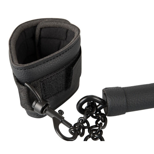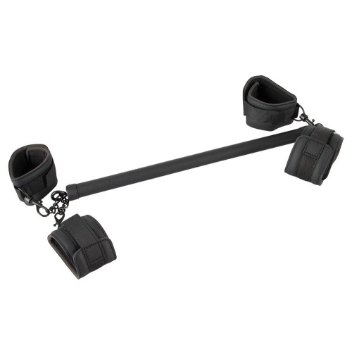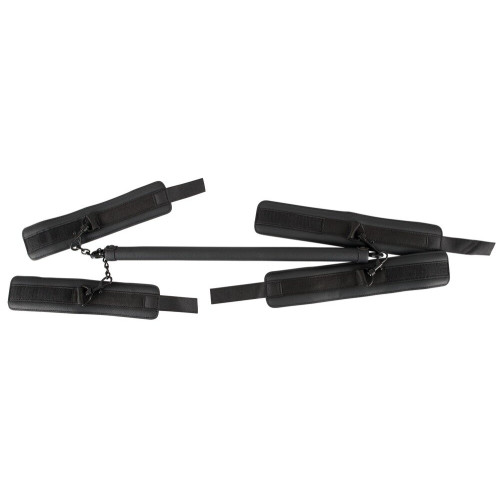 Міцна розпірна планка з кільцями для фіксації. В комплекті 2 пари наручників зі штучної шкіри з м’якою підкладкою, гачки для кріплення та короткий з’єднувальний ланцюжок. Колір: чорний. Розмір: Розпірна планка 40 см, з'єднувальний ланцюжок 10 см.