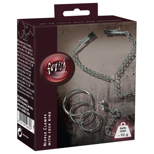 ПОШКОДЖЕНА КОРОБОЧКА старого дизайну.Для плохих парней!Y-образная цепь с ниппельными зажимами и карабинами для колец для пениса (Ø 3,6 см, 4 см и 5 см). Кольца входят в комплект. Цепи длиной - две по 17 см и одна - 25 см. Давление зажима не регулируется. Материал: серебристый металл.