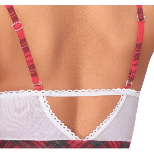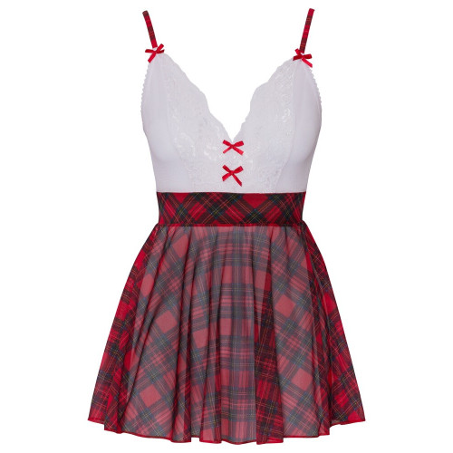 Костюм для рольових ігор складається з короткого злегка прозорого плаття та чокера із підвіскою у формі серця зі стразів. білий ліф оздоблений мереживом та кількома червоними бантиками, низ плаття в клітинку. Бретелі регулюються. Чокер застібається на гачок. Склад: 90% поліестер, 10% спандекс.