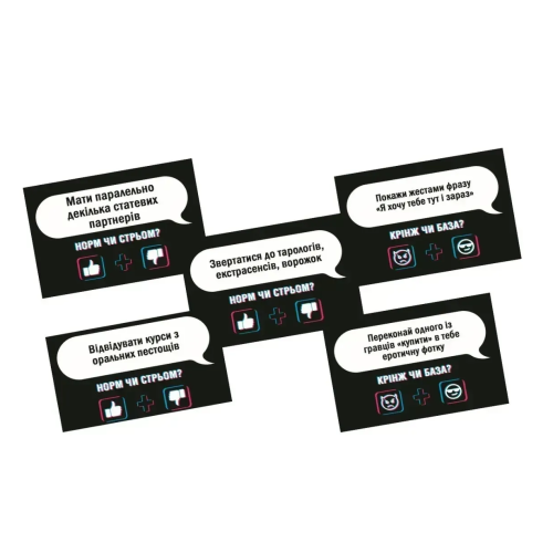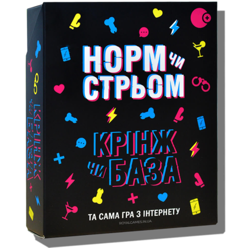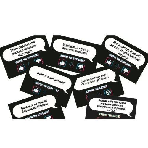 Карткова гра для компанії, яка дуже популярна у соцмережах. Весело провести час, дізнатися один про одного трохи більше, посміятись, попрактикувати сарказм, акторську гру та креативність - допоможуть 2 типи карток " Норм чи Стрьом" і "Крінж чи База".