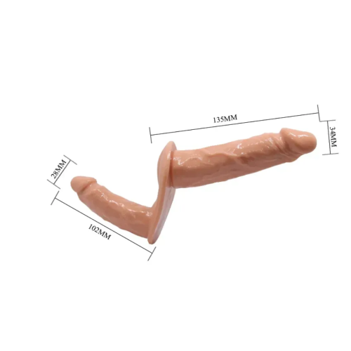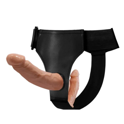 Страпон DOUBLE DILDOS Strap On с натуральным рельефом и дизайном из очень мягкого эластичного материала. Имеет реалистичную форму, ярко очерченную гладкую головку со складками, прямой ствол с венозной сеткой и небольшой реалистичный фаллос для вагинальной стимуляции, а также трусики для крепления. Трусики удобно регулируются, будут сидеть на бедрах как влитые без дискомфорта и вреда нежной коже. Главным преимуществом этого страпона является возможность насладиться фрикциями одновременно с партнером – специальный вагинальный фаллоимитатор стимулирует вагину во время полового акта.