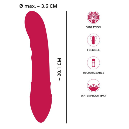 Водонепроникний силіконовий вібратор, який можна використовувати як насадку для будь-якого стандартного душового шланга, або окремо, як вібратор. 10 режимів вібрації переключаються кнопкою на іграшці. Кришка на кінці вібратора відкручується для під’єднання до душового шлангу. Заряджається за допомогою кабелю USB, який входить в комплект. Розмір: загальна довжина 20,1 см, Ø макс. 3,6 см. Колір: червоний